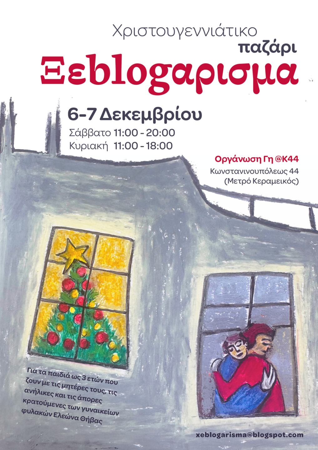 To Ξεblogάρισμα διοργάνωσε το Σαββατοκύριακο 6-7 Δεκεμβρίου το Χριστουγεννιάτικο Παζάρι του και πάλι στο χώρο της Οργάνωσης Γη Κ44 (Κωνσταντινουπόλεως 44, Γκάζι), στηρίζοντας τα παιδιά έως 3 ετών που ζουν έγκλειστα στις Γυναικείες Φυλακές Ελαιώνα Θήβας μαζί με τις κρατούμενες μητέρες τους, τις ανήλικες και τις άπορες των φυλακών.